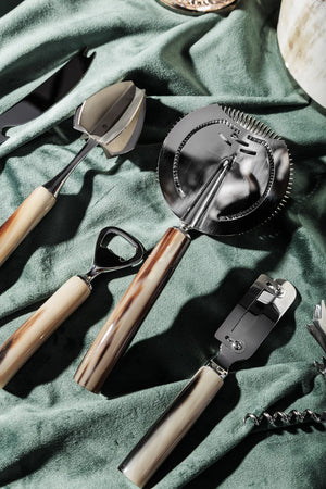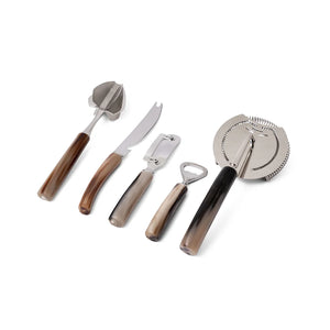 Exclusive handcrafted bar accessory set, complete with five essential tools—bar blade, juicer, lemon peeler, bottle opener, and bar strainer—each fitted with elegant natural horn handles. A refined statement of Italian craftsmanship and timeless design.